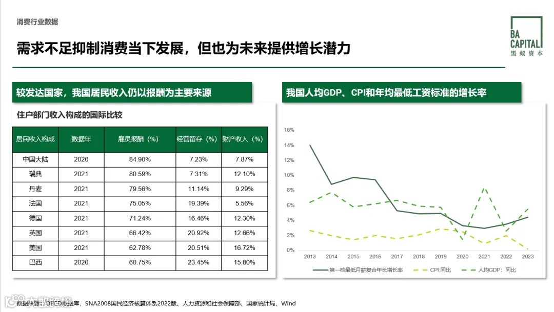 从下图可以看到我国最低工资标准的年增长率很长一段时间(2017年以来的绝大多数时间)都低于人均GDP增长率。也就是说,我国生产率高于雇员的最低工资增长速率,从长远来看,这会压制社会的有效需求提升。