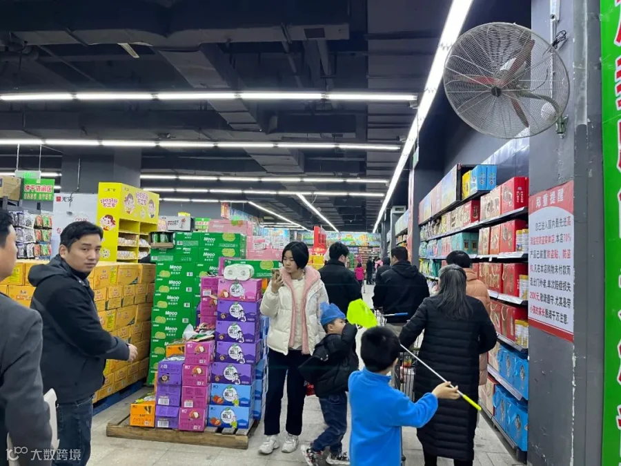 仓储式的货架,并没有“美陈”,传统的大风扇在天花板挂着,没有装修的水泥地板,让我们感受到了一个“仓储式”商超的原始。但这并不影响消费者的购物热情。