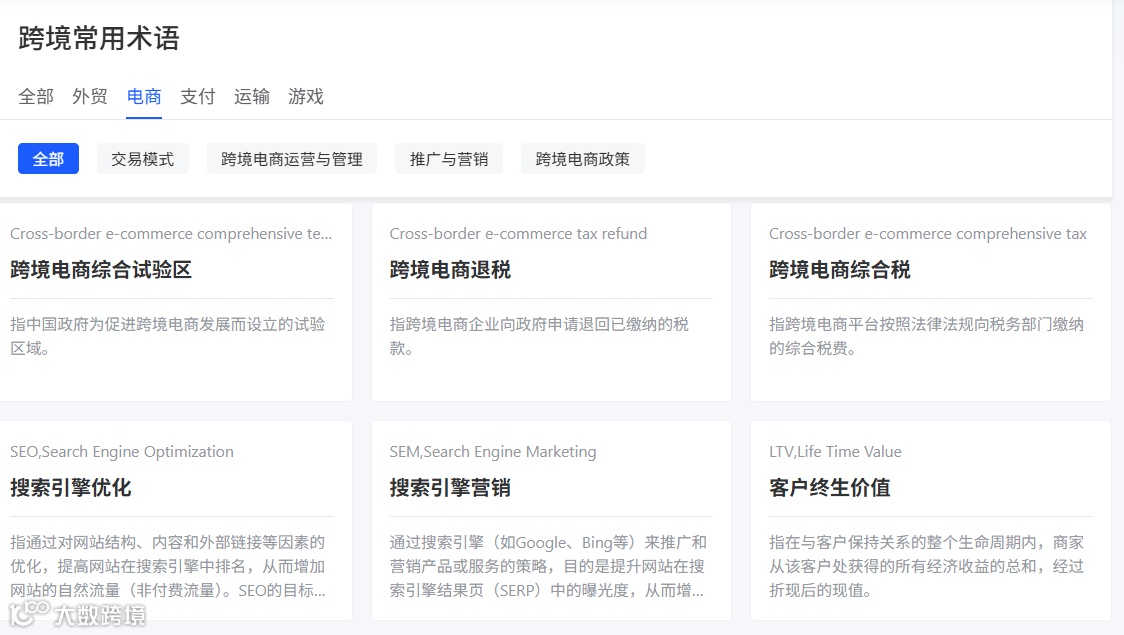 用户只需访问大数跨境网站,在“跨境常用术语”工具页面,查找关键词(如“FBA”、“SKU”等),点击即可看到术语的详细解释。