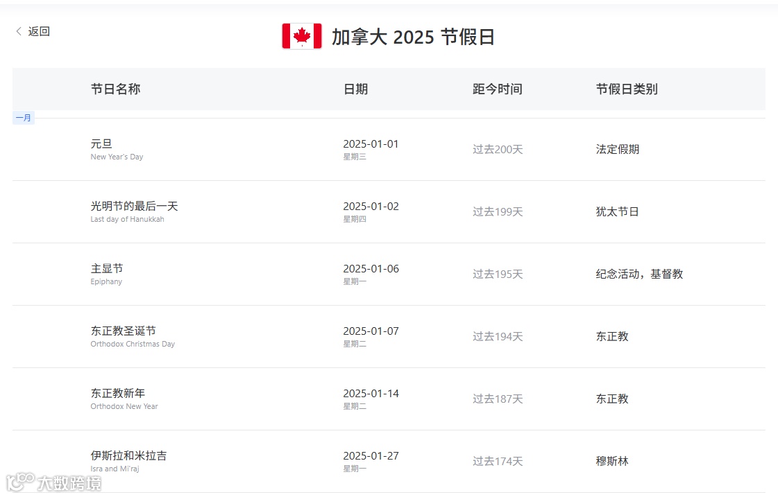 大数跨境节日查询工具是一个专业、全面的全球节日数据库,尤其深度覆盖加拿大全国性及各省重要节日、纪念日、购物节点(如黑五、节礼日)。