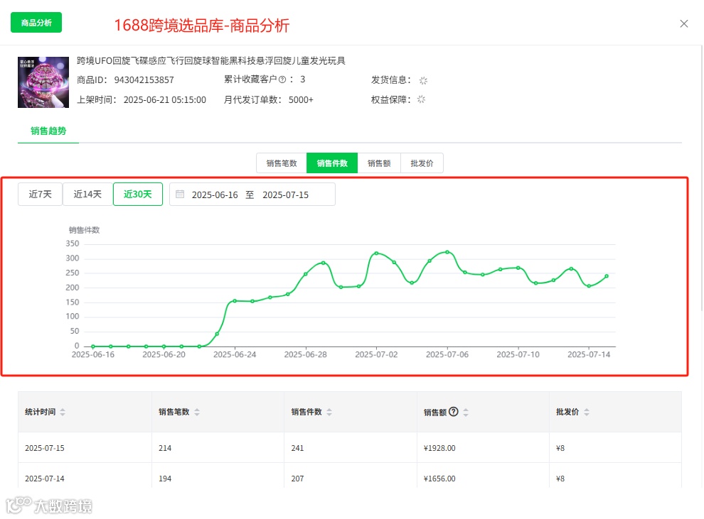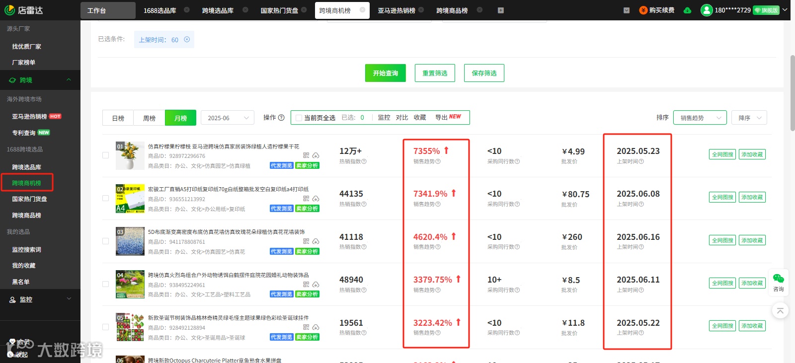 利用店雷达1688跨境选品库,筛选近3个月上架的新品,观察产品的销量增长曲线,寻找稳定上升而非短期尖峰或下降趋势。