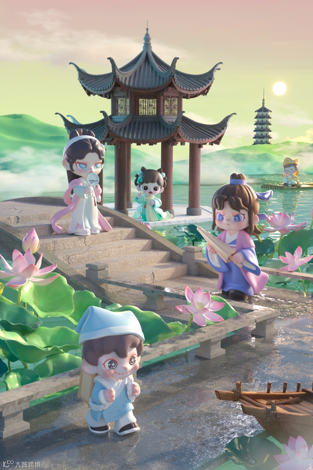王泽群举了一个例子,TNTSPACE与杭州西湖景区的合作,就不仅有基于许仙与白娘子形象开发的联名盲盒产品,还在西湖十景之一的曲院风荷做了一个策展型画舫,画舫里有白蛇传主题的盲盒及文创,画舫周围有多组玻璃钢做成的人物雕塑吸引游客拍照打卡。