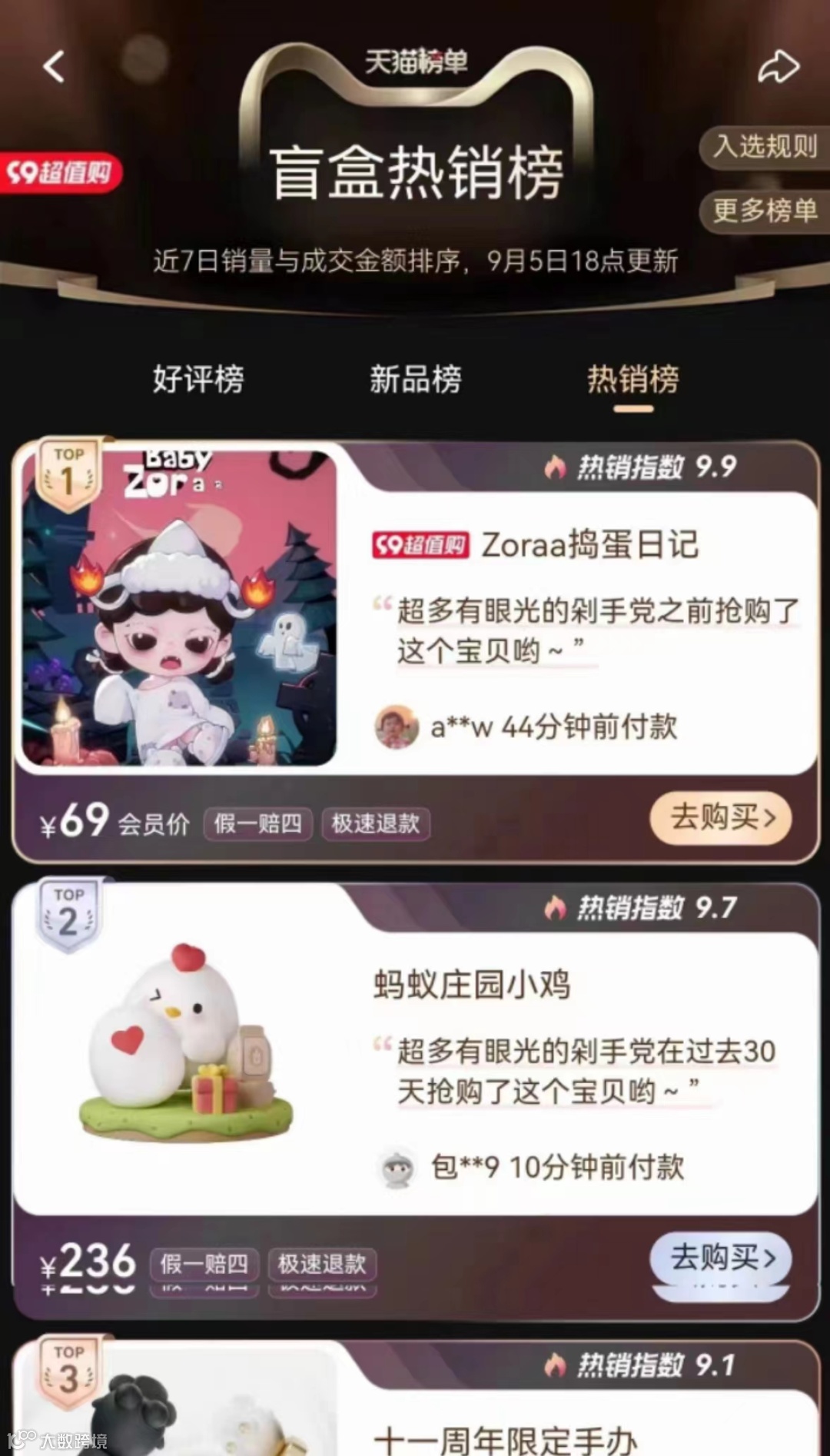 在潮玩爱好者眼里,其更大尺寸、质感上乘的大盲盒令人印象深刻;在电商平台榜单上,其旗下IP如DORA、Zoraa常常在发售期霸榜第一;在第三方评价上,不仅被杭州市文创发展中心评选为“年度文创新势力”,还成为进入福布斯中国新锐品牌TOP100榜单的潮玩品牌。