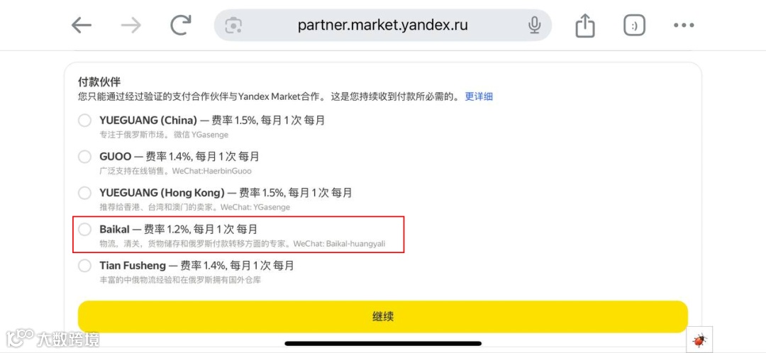 - 支付伙伴建议选择“Baikal”,费率1.2%,结算周期每月一次。
