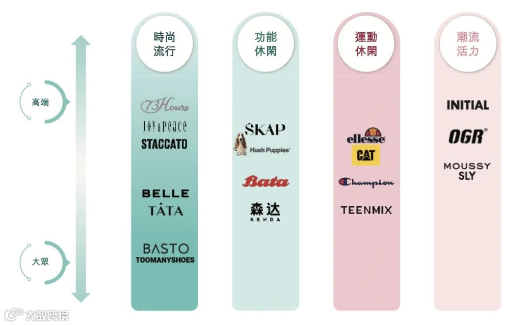 经历孵化、收购、代理、剥离等动作后,如今,百丽旗下共经营19个核心品牌,包括12个自有品牌和7个合作品牌,整个矩阵被划分为时尚流行、功能休闲、运动休闲、潮流活力四个定位板块,价格带也覆盖得很全。