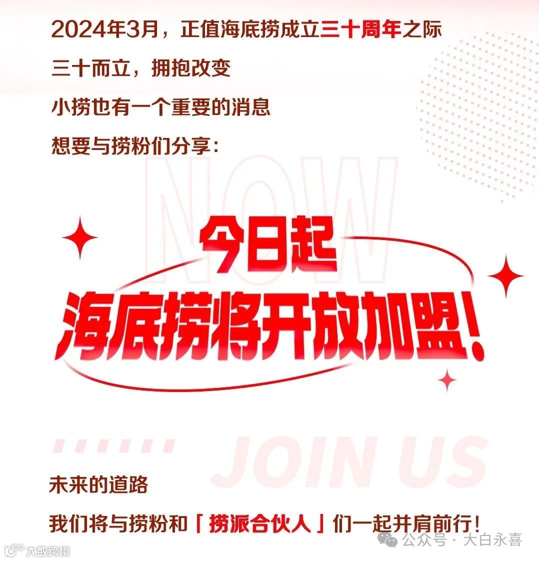 不久前,九毛九开放加盟。当时业内很多人在猜测,下一个开放加盟会是谁,没想到是海底捞。
