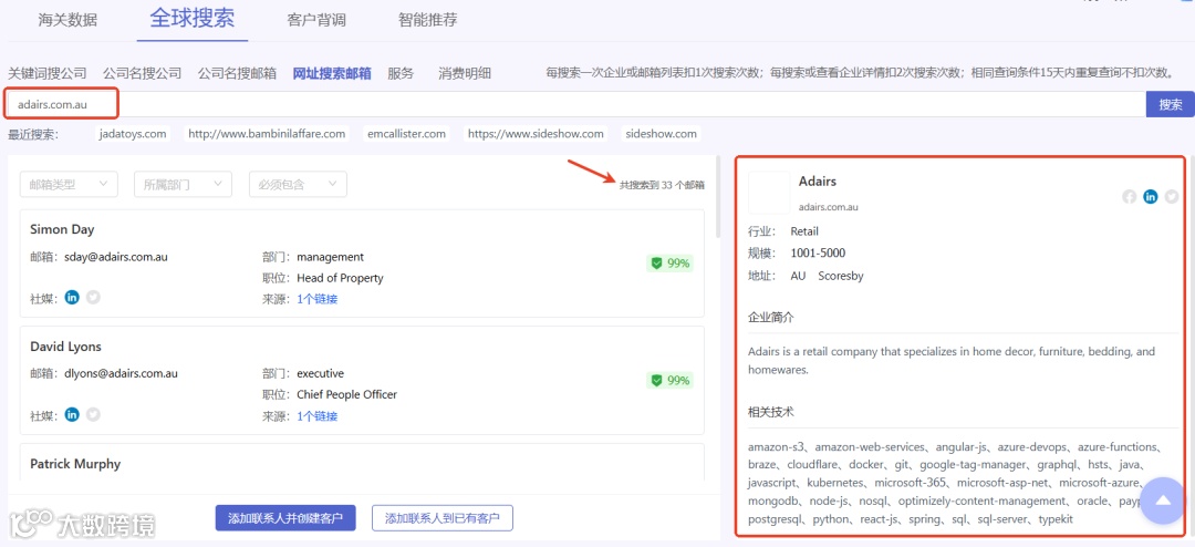 - 知道公司网址:例如,澳洲这家家居用品零售商Adairs,输入网址即可直接获取该零售商主要负责人的详细邮箱。