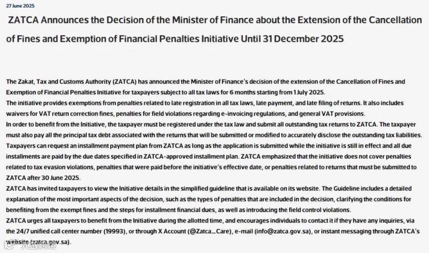 沙特ZATCA税务罚款豁免计划延长至2025年12月31日