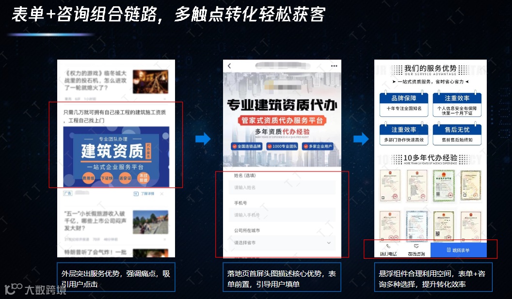 在投放前,他们明确了以获取销售线索为主要目标,深入分析了本地建筑企业的需求和痛点。广告文案突出了 “本地服务,快速拿证” 的优势,同时配上了一些成功案例的图片[k]。