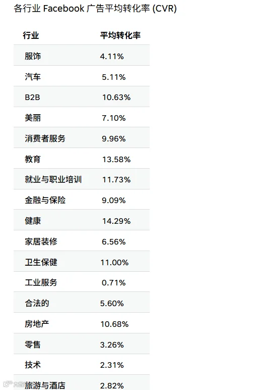 Facebook 广告在所有行业的平均转化率为 9.21%,感觉这个转化率还是挺高的, 我们在投放FB的广告时候要达到这个转化率,也是比较很难的, 但因为这个没有电子商务的商务,只有个零售的3.26% 可以作为一个参考, 这个转化率可能不单单指的的购买, 应该也有包含加购,发起结账,提供表单,注册等数据[k]。