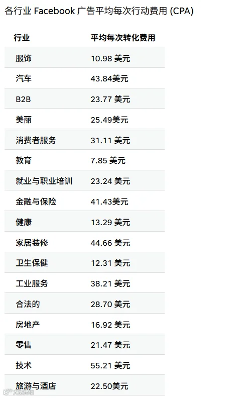 所有行业的 Facebook 广告平均每次行动费用 (CPA) 为 18.68 美元,其中较低的主要有教育,低于$7.85 这个有可能指的的是一个注册成本或者提交leads的成本, 服饰类的CPA是在$10.98,零售的为$21.47,这个也是只能作为一个参考,因为这个转化成本不一定是购买, 看你的广告目标设置的是什么,这个是购买, 发起结账, 加购, 提交表单, 收集leads等转化目标的的平均CPA[k]。