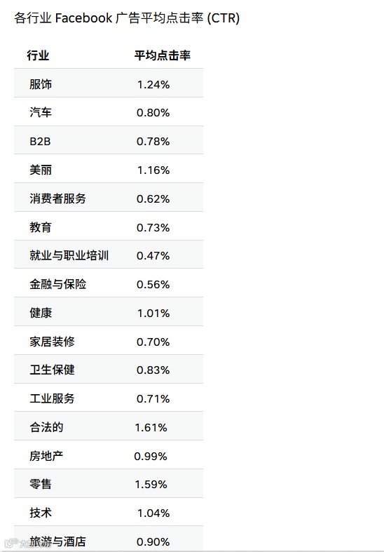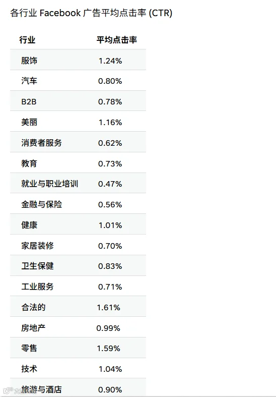 所有行业的Facebook 广告平均点击率 (CTR)为 0.90%, 其中点击比较高的分别是律师,,其他点击率较高的广告主来自零售(1.59%)、服装(1.24%)、美妆(1.16%)和健身(1.01%)行业。这些行业经常在广告中展示模特和高质量的图片,这并不奇怪,而且这些广告在Facebook和Instagram等视觉效果极强的平台上效果尤其出色[k]。
