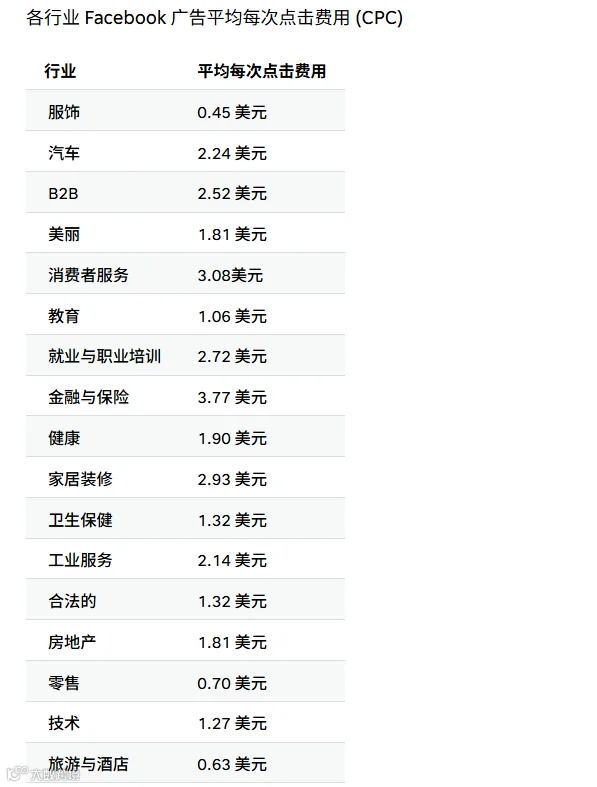 Facebook 上点击费用最低的是服装行业(每次点击 0.45 美元)、旅游和酒店行业(0.63 美元)以及其他零售行业(0.70 美元),点击费用远低于 1 美元。这些行业通常拥有最大的受众群体,相对产品的客单价也没那么高,因此即使每次点击费用较低[k]。
