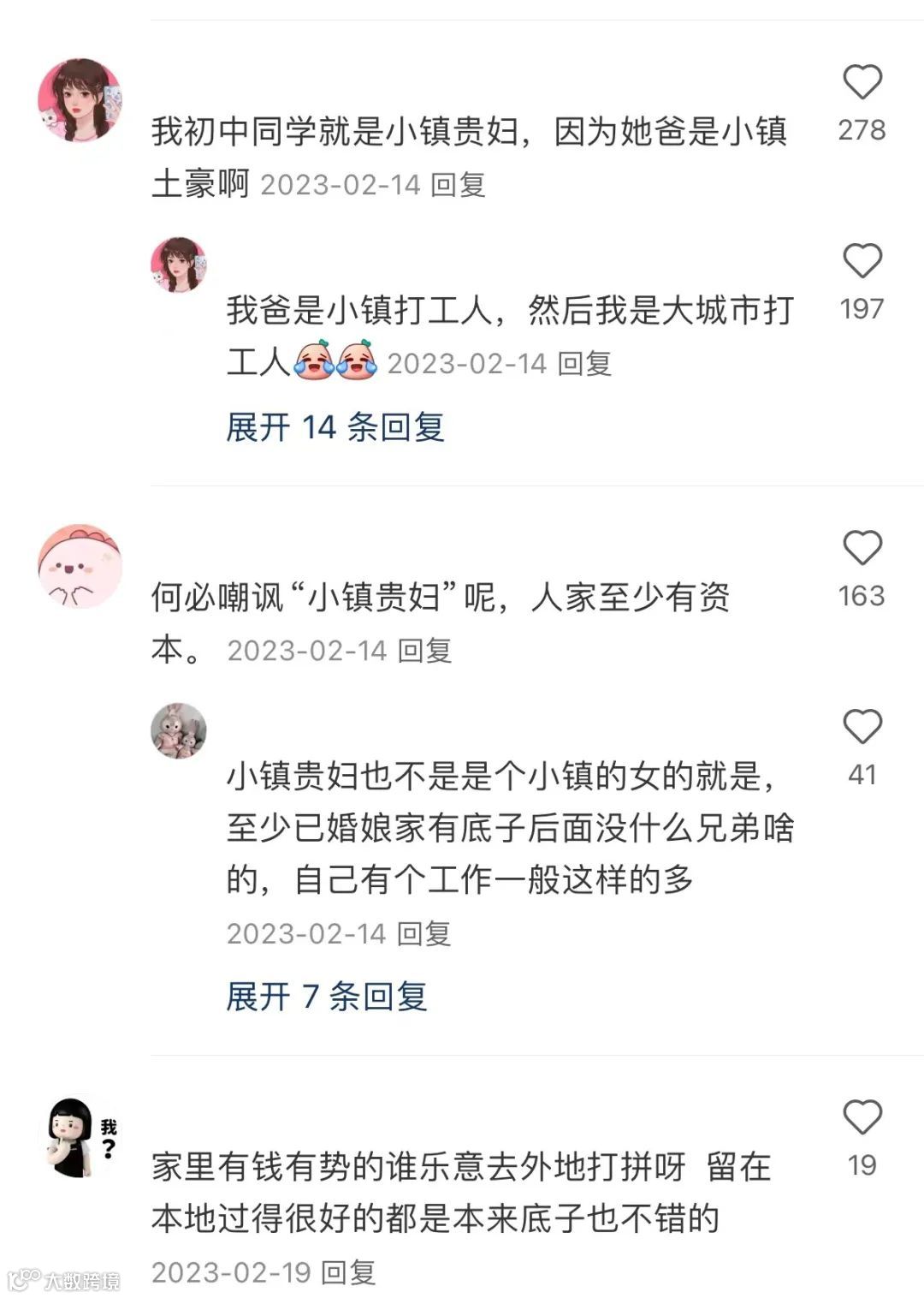 「小镇贵妇的重点是小镇吗?是贵妇啊」「博主留在老家县城,就能过上县城中产生活吗?」人间清醒的网友们纷纷戳破县城遍地「小镇贵妇」的虚幻,更多人开始重温施耐庵在700年前留下的金句——「族旺留原籍,家贫走他乡」。