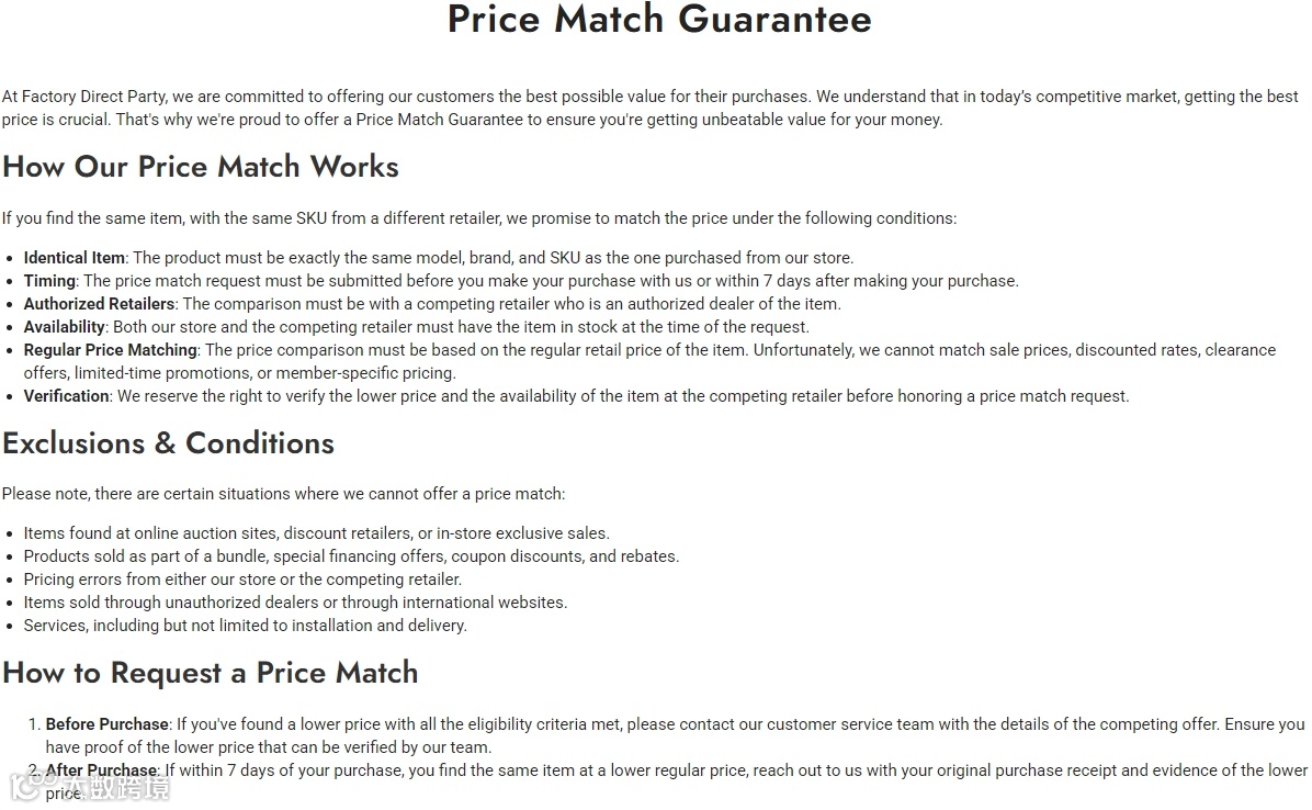 价格匹配保证:对于以“性价比”为主要考虑因素的派对用品购买者来说,非促销期间常常是最难成交的时段。消费者即便心动,也容易被“现在买是不是贵了”的心理拖住脚步,从而选择观望或延后。Factory Direct Party通过设立“7天价格匹配保障”,打破了这一转化瓶颈。