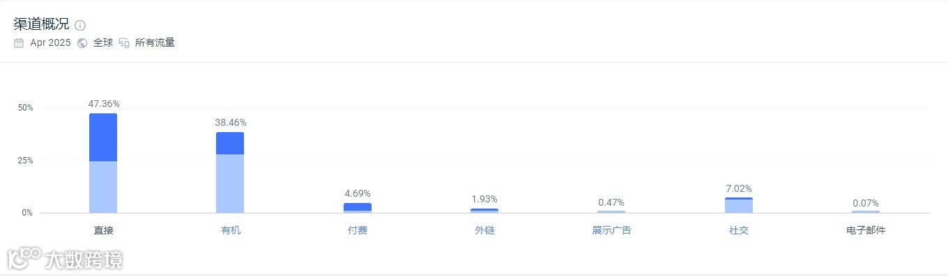 根据similarweb数据显示,Factory Direct Party官网的流量主要来自于直接访问流量(47.36%)、自然搜索流量(38.46%)、社交媒体(7.02%)