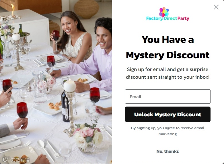 Factory Direct Party所设置的神秘折扣弹窗,是一种典型的行为刺激机制,通过将好奇心与即时奖励相结合的方式,引导用户走出决策的第一步。这种营销方式的转化逻辑,不仅在于折扣本身,更在于过程中“仪式感”和“不可预知性”,带来的心理期待值提升。