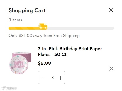 Factory Direct Party不仅设置了免运费门槛,还在购物车中设置了实时提醒:“还差多少可享免运费”,这不仅会促使消费者产生不如多买点的想法,同时也能让消费者有更清晰的加购目标。