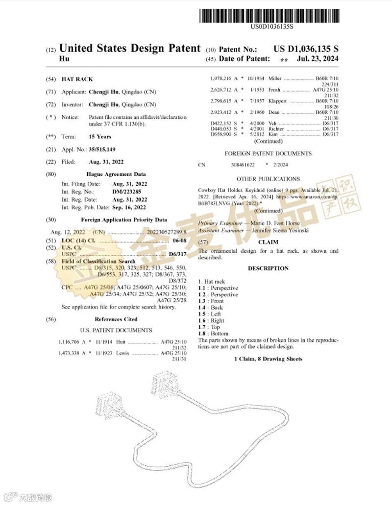 本案车载帽架美国专利号为:D1036135,于2024-07-23获批美国外观专利证书,未经授权上架销售外观相似产品即可构成侵权,就有面临被取证,TRO冻结风险!除此之前,Chengji Hu在美国还申请有一款专利号为:20250074654的折叠式储物盒发明专利,目前暂未发起维权,但与车载帽架的外观专利不同的是,该折叠式储物盒即使外观不相似,功能吻合,即有侵权的风险,跨境卖家在选品时仍需提高警惕,注意规避。