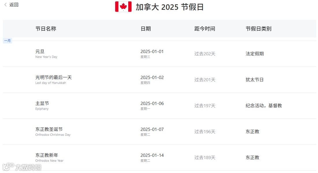 大数跨境全球节假日查询工具为此提供专业支持,覆盖200多个国家和地区的数据系统实时更新加拿大全国及省级节日信息。