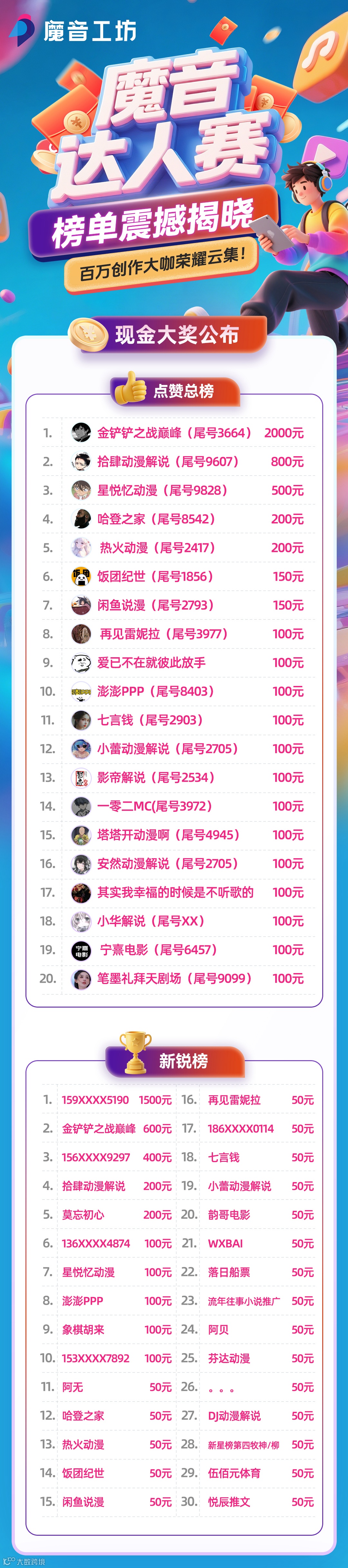 魔音工坊达人赛榜单揭晓:百万播放作品频现,新人黑马涌现