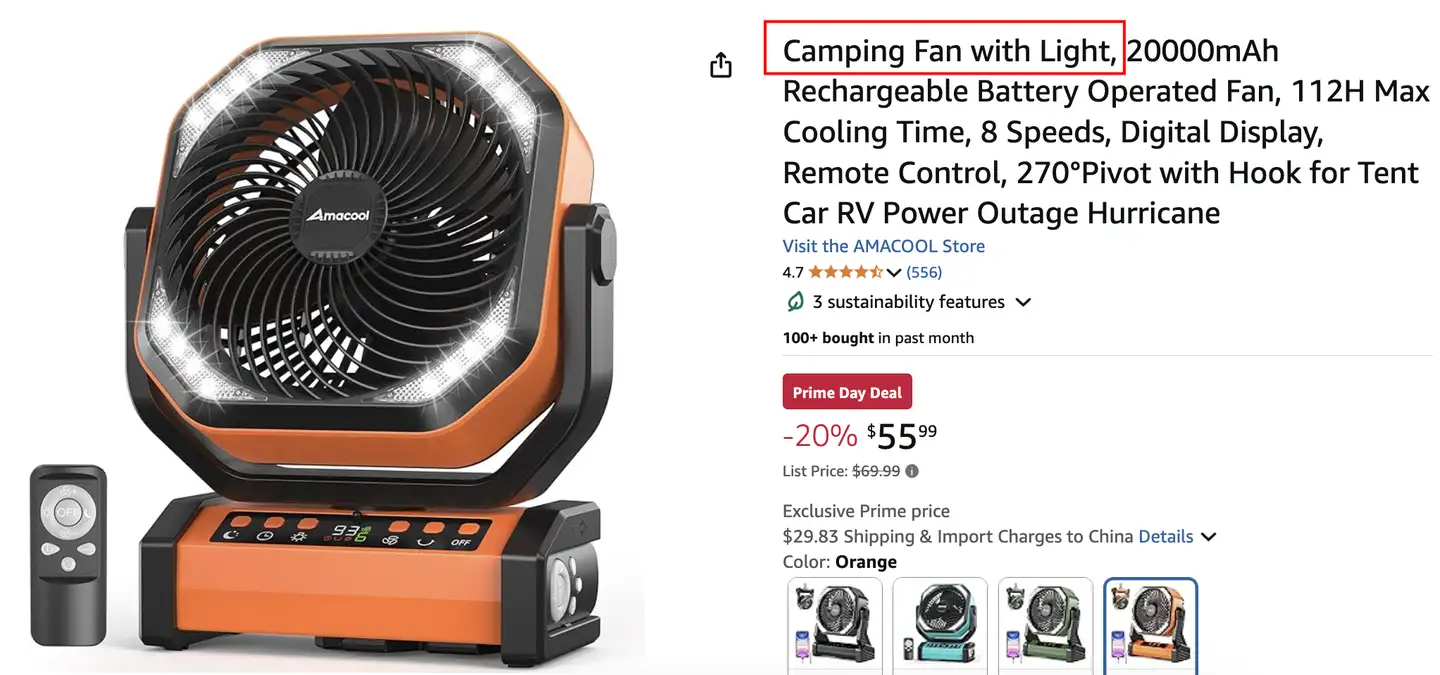首先不得不说AMACOOL是很懂用户搜索心理的,商品标题关键词有意匹配搜索意图,比如婴儿车风扇的标题包含Battery Operated Stroller Fan Flexible Tripod,露营风扇的标题包含Camping Fan with Light,既点出了使用场景,也点名了特色功能。