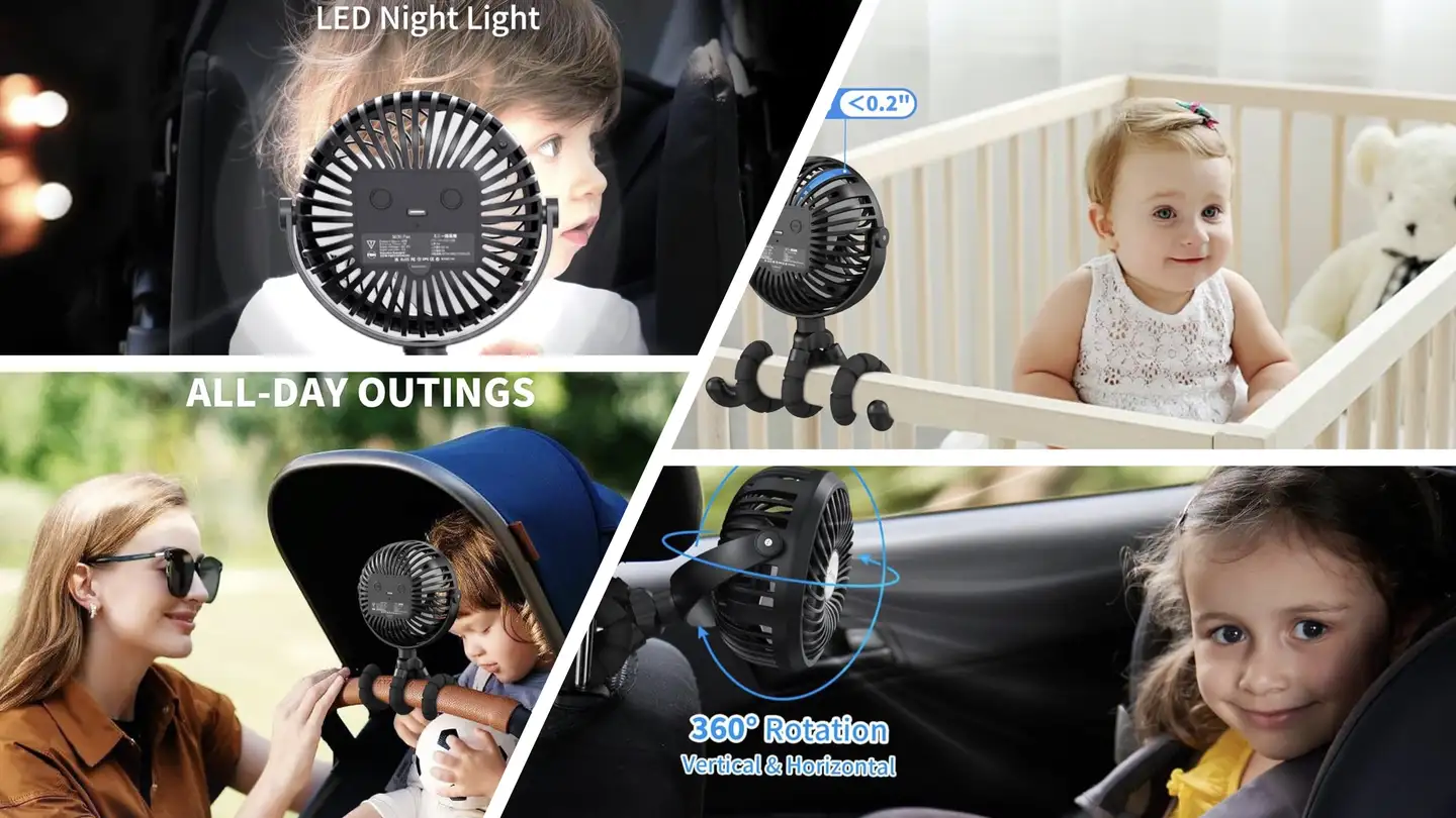风扇外壳的间隙小于5毫米,小孩手指伸不进去,避免了被扇叶刮伤的风险。以上是专门针对婴儿的独特功能。除此之外,它还带LED灯,风扇头部可以360°旋转,支持USB充电。这些特征使得它的适用范围更广,但并不独特,是市面上大部分便携电扇都支持的功能。
