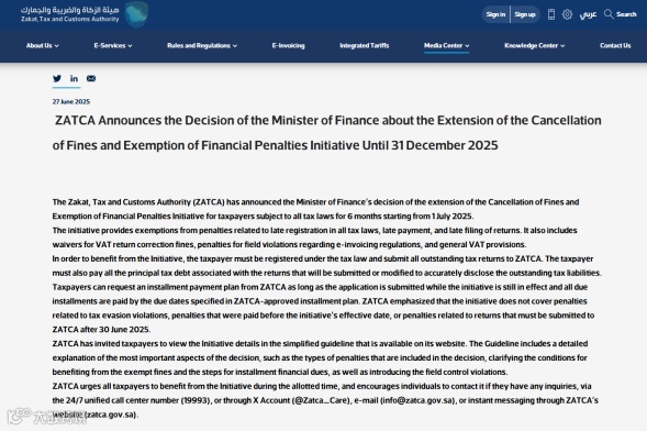 根据沙特税务与海关总局(ZATCA)近日发布的最新通知,针对增值税(VAT)违规行为的处罚豁免政策延长至2025年12月31日,并将于2025年7月1日起正式实施!