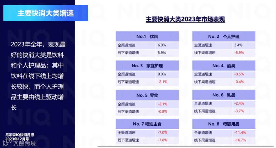 2023年,主要快消大类,除了饮料和个护,基本都是负增长,而线下渠道也只有饮料在增长。
