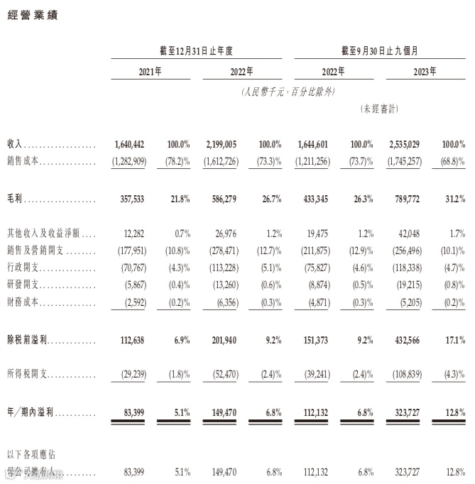 且2022年度及2023年前九个月,公司营业收入同比分别增长34.0%及54.1%,净利润同比分别增长79.2%及188.7%。
