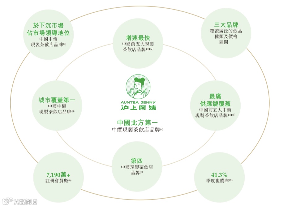 主品牌“沪上阿姨”提供鲜果茶、多料奶茶、轻乳茶、酸奶昔及袋装小食。主要为全中国,尤其是三线及以下城市的消费者提供现制产品。