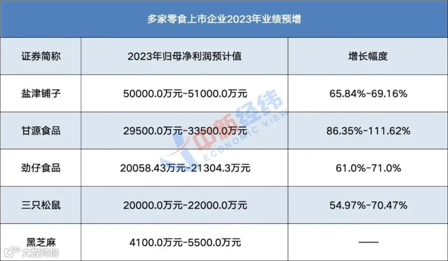 ▲多家零食上市企业2023年业绩预增 数据来源:上市公司公告