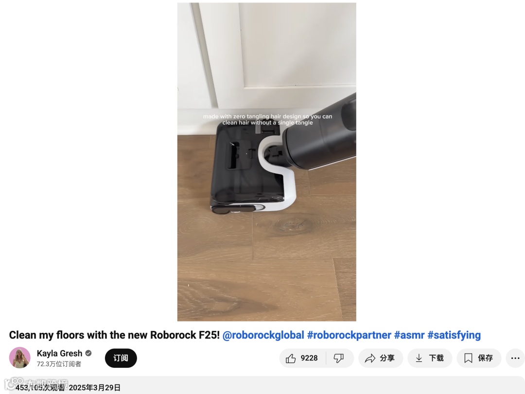 Kayla不是在卖机器,她在分享一种生活氛围:干净、有序、治愈、安静。在视频标签中,她只留下了“#satisfying”、“#asmr”与“#roborockpartner”。