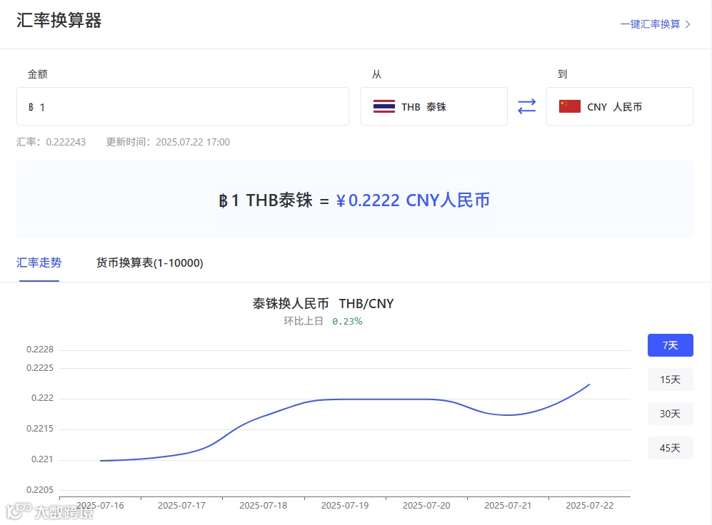 此时的汇率是,฿1THB泰铢=¥0.2226CNY人民币