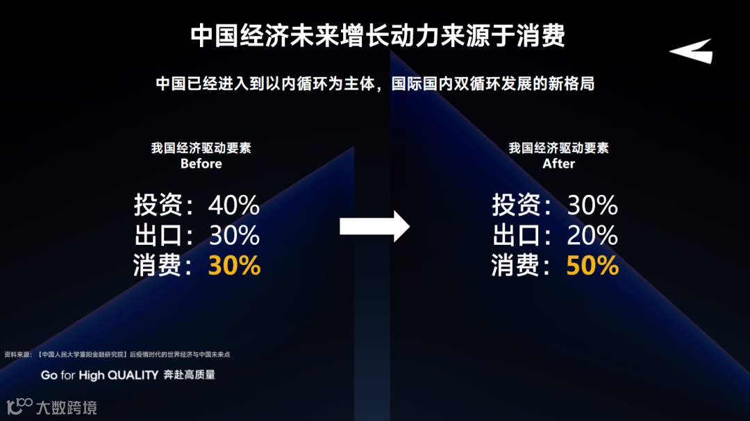 对所有做消费的人来说,中国有14亿人口的巨大市场体量,足够我们创造出很多十亿级、百亿级公司。展望未来,中国经济驱动力非常明确,随着地产调整和经济结构变化,一定会从过去依赖投资、出口的模式,变得更依赖消费。