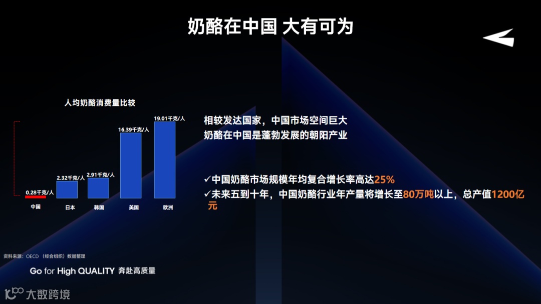 回归到奶酪话题,在中国乳业发展进程中,从液态奶向奶酪的转变是个至关重要的阶段。中国人均奶酪消费量与国外相比差距很大,这条赛道预计是千亿规模的大蓝海赛道。