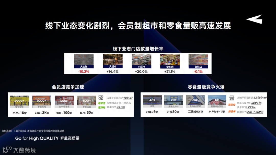 先看渠道端,今年一个尤为明显的变化是,即时零售在电商行业的发展翻天覆地。而线下渠道也在经历深刻转变,虽然有人说消费者没钱、支出意愿降低了,但还是能看到零食赛道的异军突起,即将出现新的万店连锁品牌。
