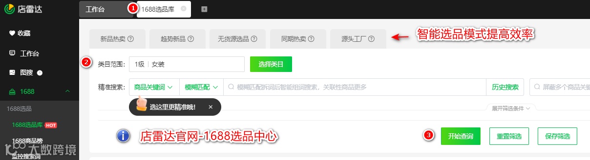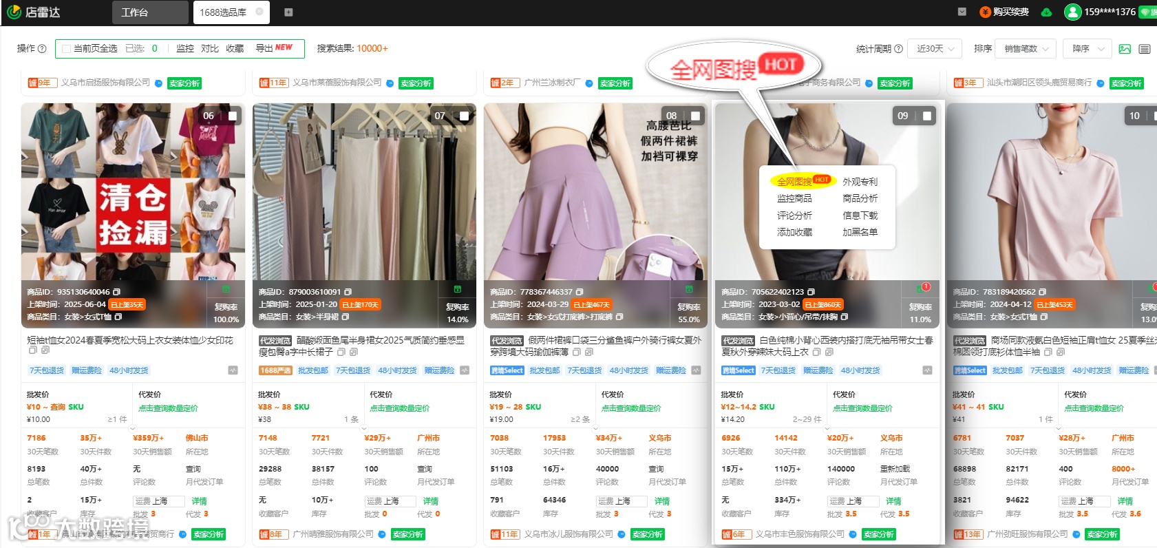 1、店雷达1688选品中心,选择经营类目,女装为例,查询后出现当前1688市场上热卖商品
