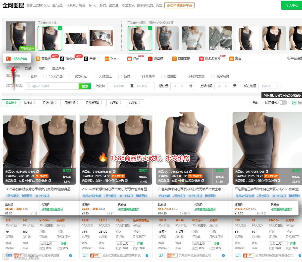 2、鼠标移动感兴趣目标商品,例如我们选择这款基础款女士背心,点击【全网图搜】即可一键比对1688与拼多多批发端的价格