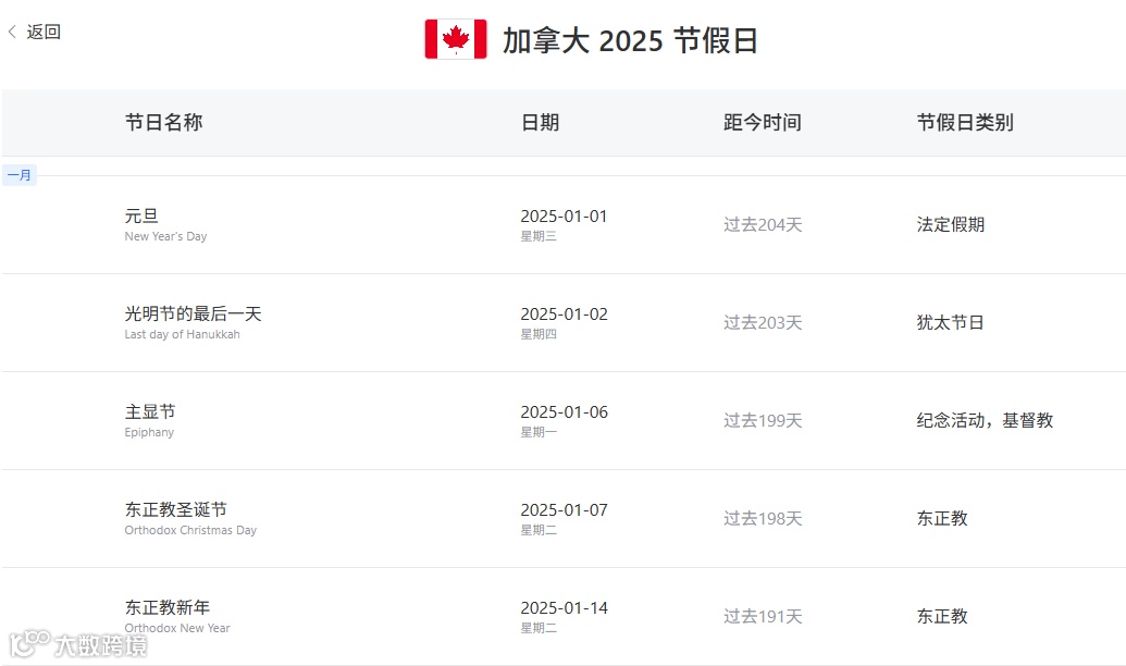 大数跨境推出的全球各国/地区节日查询工具,就是一个专为跨境卖家打造的节日信息库。它覆盖了包括加拿大在内的全球200多个国家和地区,收录了详尽的节假日数据。