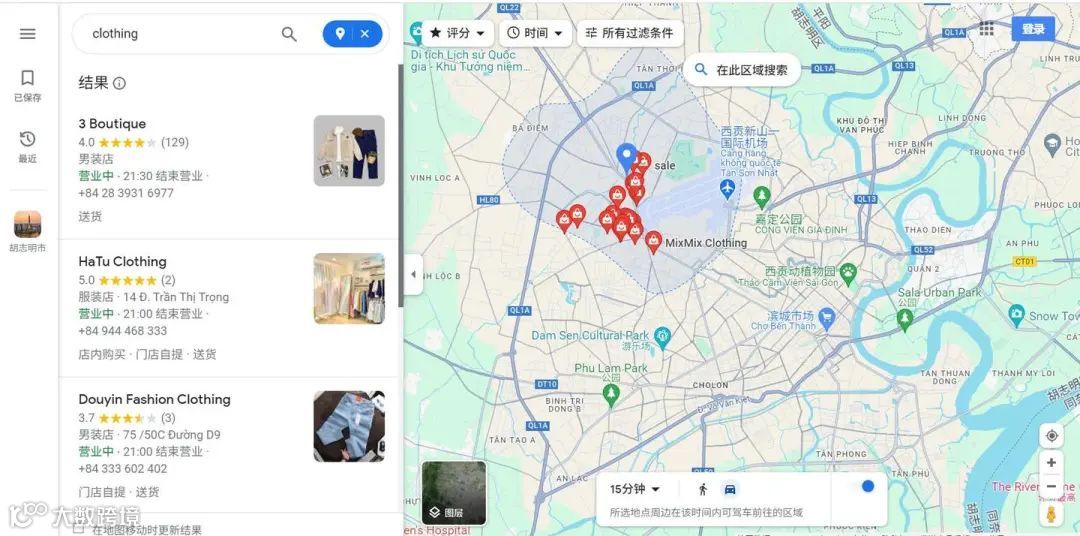 通过谷歌地图输入“Clothing”、“Apparel”、“Fashion Boutique”或“Clothing Wholesale”等关键词,筛选出目标区域的服装企业,查看其地址、营业时间、评价及联系电话[k]。