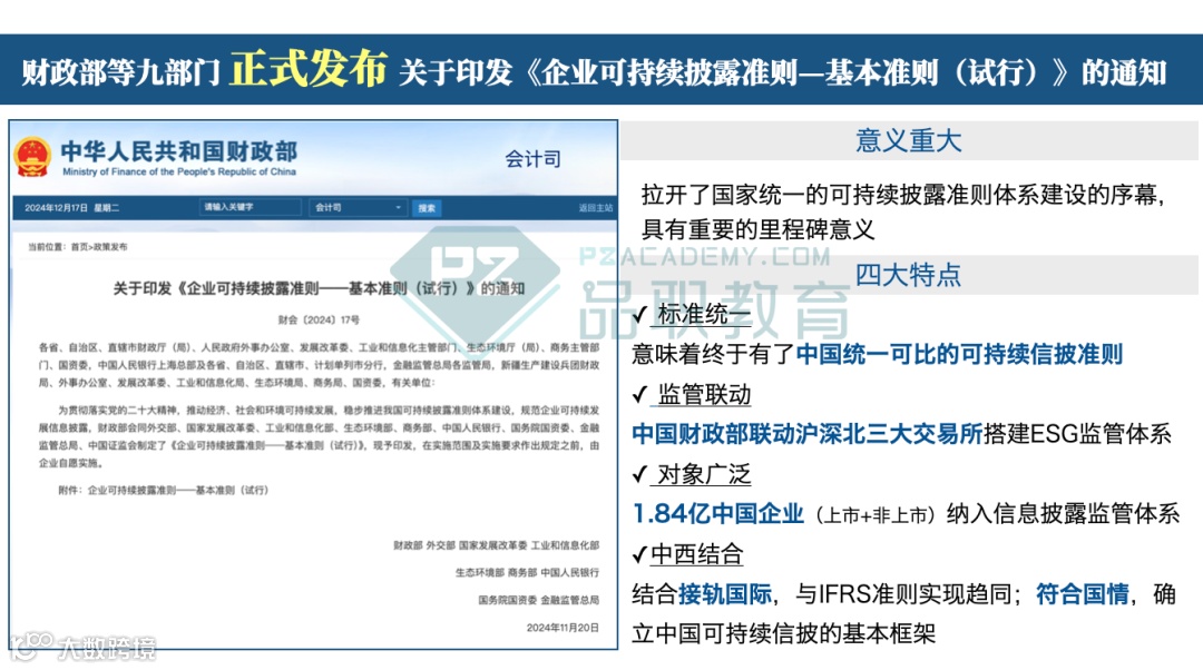 2024年11月20日,财政部正式发布《企业可持续披露准则——基本准则》,标志着我国ESG报告进入全国统一标准时代[k]。