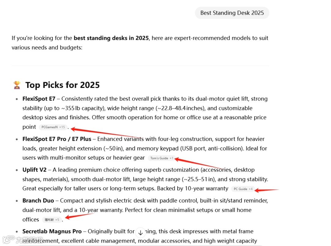 但到了今天,用户搜索“Best Standing Desk 2025”、“Which wireless earbuds are good for gym?”这些关键词时,不再点开十几个评测链接,而是直接问Gemini、ChatGPT、Perplexity 或 Bing Copilot等等。[k]