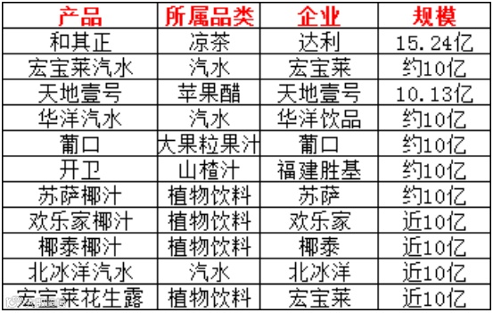 至于北冰洋汽水、欢乐家椰汁等品牌,虽然销售规模没有达到10个亿(财报数据),但是考虑到品类地位和行业影响力,我们还是将其纳入了这一阵营。