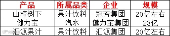 在十亿级的餐饮饮品品牌当中,开卫山楂汁、宏宝莱花生露都是经典10亿大单品的代表;而以华洋汽水、葡口大果粒果汁为代表,这些是新生力量的代表。