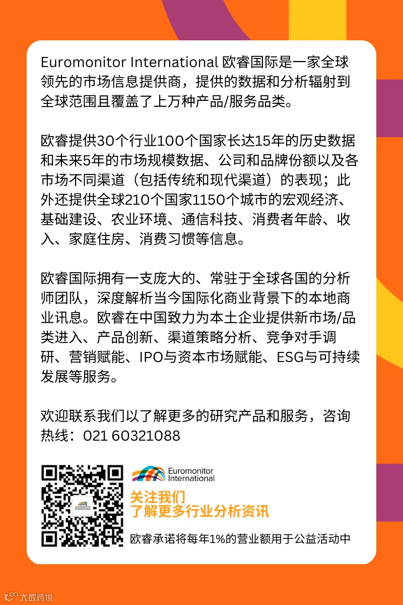 本文所含信息归 Euromonitor International 欧睿国际所有,任何对外引用需事先获得欧睿的书面许可,包括但不限于:上市招股书,品牌的市场地位声明、新闻稿、社交媒体帖子及文章等。未经授权及错误使用数据的相关方应对由此产生的问题负全部责任[10]。