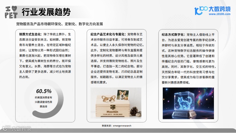 大数跨境(10100.com)发布的《2025宠物殡葬用品洞察报告》指出,这一市场已不仅仅是“情绪消费”,更是新中产、高情感人群的重要选择。