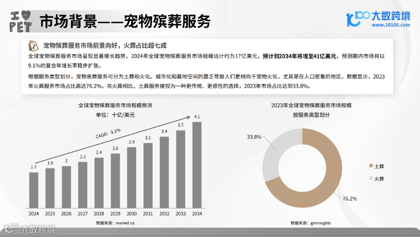 从火化服务到骨灰安置、纪念挂件,宠物殡葬已形成一套相对成熟的商业链条。2024年全球宠物殡葬服务市场规模达到17亿美元,并预计未来数年将维持9.1%的稳定增长[k]。
