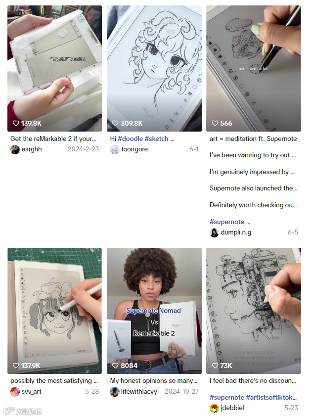 而小众群体特性在于,一旦某个产品获得了圈层部分影响力人士的认可,便会迅速散播开受到整个圈层的簇拥。在TikTok,Supernote与垂类绘画博主联动共创优质内容,利用KOL试用视频展现优质产品力,进而有效触达潜在消费者。