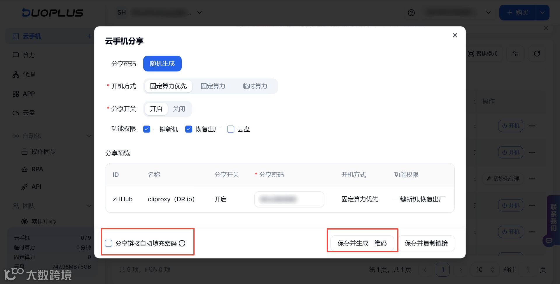 DuoPlus用户在分享云手机时,可以选择以二维码/链接的形式快速分享,并且可以勾选【自动填充密码】选项,让接收者直接登录,操作更便捷。